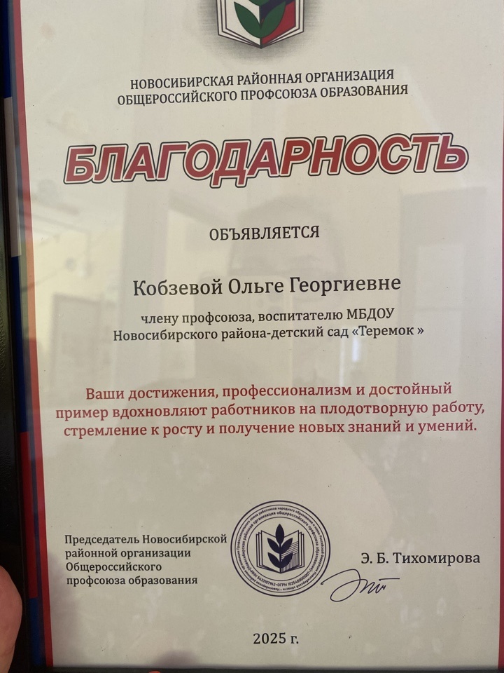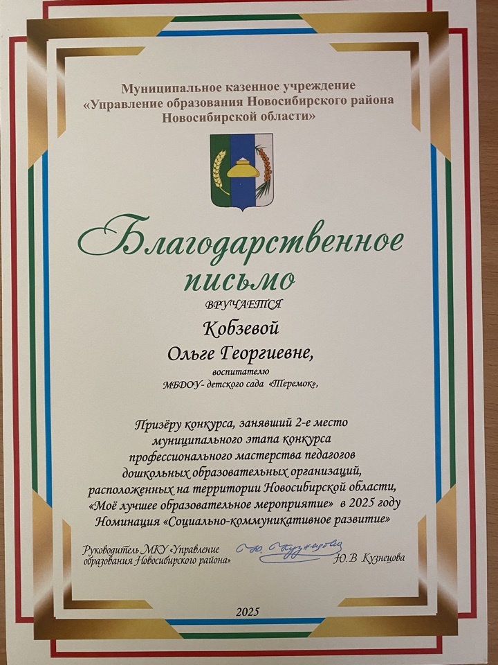 Благодарственное письмо за призовое - 2-е место муниципального этапа Всероссийского конкурса "Воспитатель года России - 2024"